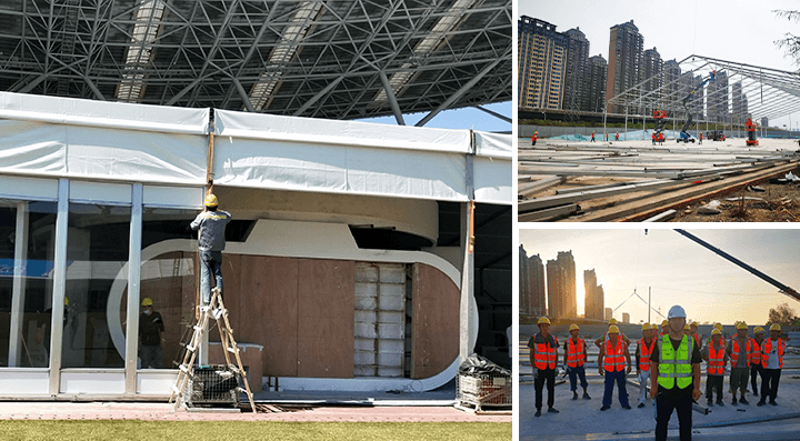 弧形展覽篷房是市場上強大和設計精良的篷房,給我們提供了靈活和可用的空間更具時代感?;⌒闻穹亢侠磉\用了中國傳統建筑的設計元素,將篷頂斜梁進行預彎后達到的弧形效果。